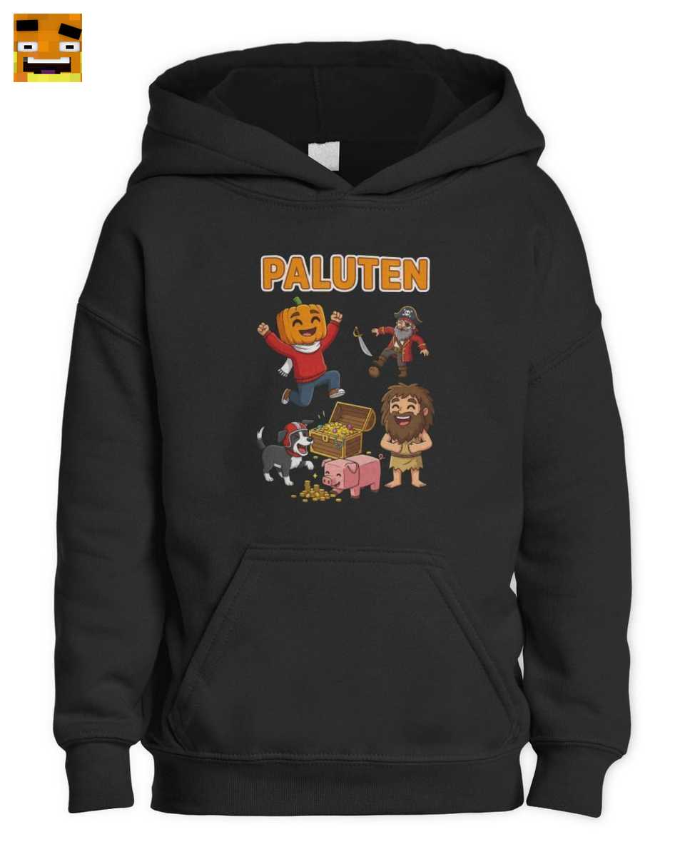 Gemeinsam hat die Crew gerade eine prall gefüllte Schatzkiste entdeckt, die vor Goldmünzen nur so überquillt – ein Symbol für den Erfolg und den Spaß, den man bei gemeinsamen Abenteuern hat. Der große, orangefarbene “PALUTEN” Schriftzug über der Szene lässt keinen Zweifel daran, wem hier gehuldigt wird. Das gesamte Design ist im farbenfrohen, dynamischen Cartoon-Stil gehalten, der perfekt zur Zielgruppe passt und gute Laune versprüht.
