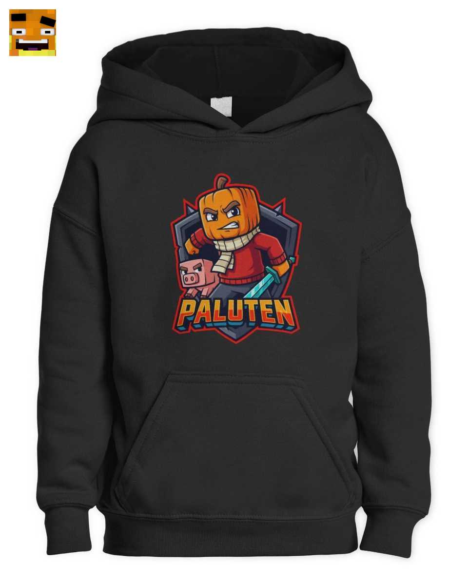 Im Zentrum steht Paluten selbst, dargestellt in seinem legendären Kürbis-Skin. Der Kürbiskopf ist nicht nur eine Maske, er ist ein Symbol für Palles verspielte und doch zielstrebige Art in der Welt von Minecraft. Mit entschlossenem Blick, seinem bekannten roten Pullover und dem gestreiften Schal ist er sofort wiedererkennbar. Er ist der Held, mit dem sich junge Fans identifizieren – bereit, sich jeder Herausforderung zu stellen.