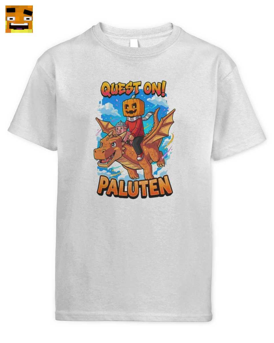 Der Schriftzug “Quest On!” ist das i-Tüpfelchen des Designs. Es ist nicht nur ein Spruch, sondern eine Lebenseinstellung, die Paluten in seinen Videos vermittelt. Es steht für Neugier, den Willen, Herausforderungen anzunehmen und niemals aufzugeben – sei es im Spiel oder im echten Leben. Dieser motivierende Aufruf macht das T-Shirt zu einem positiven Statement. Der lebhafte Cartoon-Stil des gesamten Drucks ist farbenfroh und dynamisch, perfekt für die junge Zielgruppe. Es ist das ideale Kürbiskopf Gamer Shirt für alle, die zeigen wollen, dass sie Teil von Palutens fantastischer Welt sind.