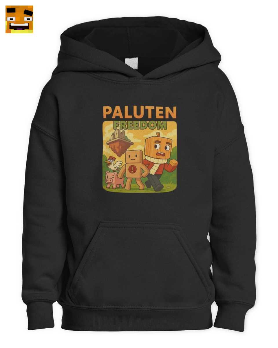 Dieser Hoodie ist nicht einfach nur ein schwarzer Kinder Kapuzenpullover. Er ist eine Leinwand, die eine Geschichte erzählt – die Geschichte von Minecraft Freedom. Jeder wahre Fan wird die unzähligen Details erkennen und lieben. Im Zentrum steht der unverkennbare Schriftzug ‘PALUTEN FREEDOM’, der stolz über der Szene prangt und sofort klarstellt, wofür das Herz des Trägers schlägt. Darunter entfaltet sich eine farbenfrohe und detailverliebte Szene im typischen Pixel Art Stil, der an die geliebte Block-Welt erinnert.