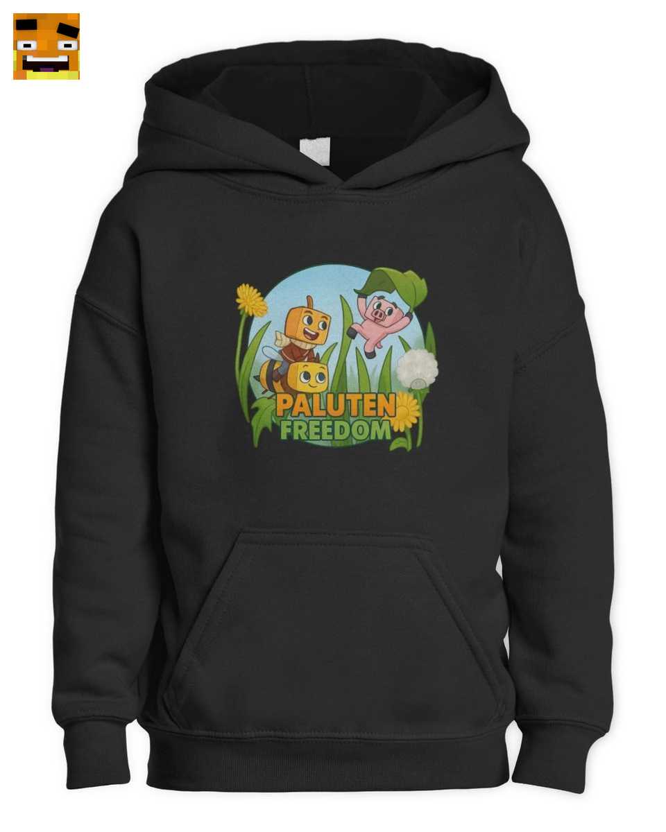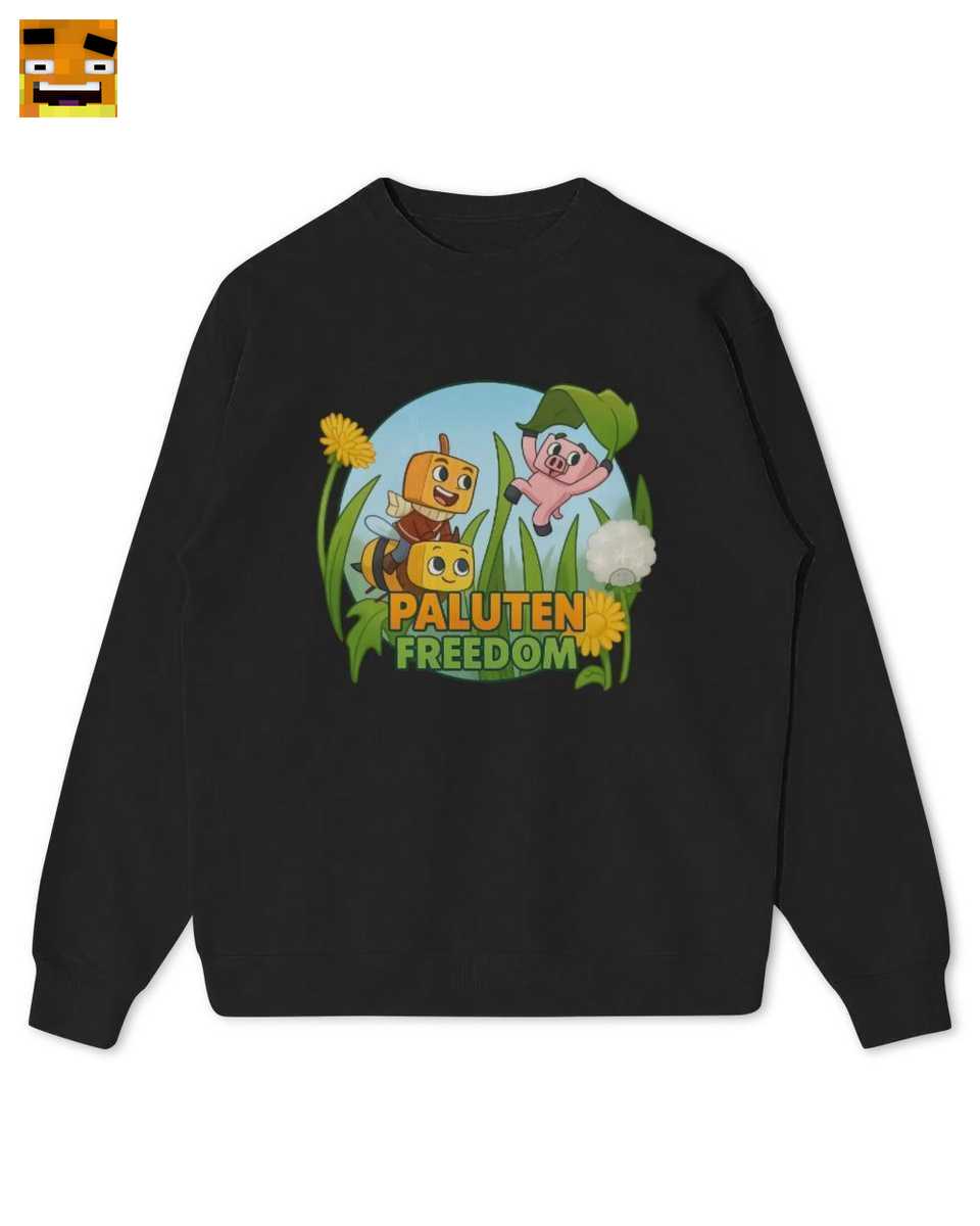Neben ihm schwebt Edgar, das Schwein, der heimliche Star vieler Geschichten. Mit einem kleinen Blatt als Regenschirm oder Sonnenschutz ausgestattet, verkörpert er den liebenswerten und manchmal etwas tollpatschigen Sidekick, ohne den die Abenteuer nur halb so lustig wären. Dieses Motiv, bekannt als “Edgar das Schwein T-Shirt”, ist bei Fans besonders beliebt. Die gesamte Szene ist auf einer idyllischen Wiese mit Löwenzahn unter einem strahlend blauen Himmel angesiedelt, was eine positive und unbeschwerte Atmosphäre schafft. Abgerundet wird das Kunstwerk durch den prominenten Schriftzug ‘PALUTEN FREEDOM’, der das legendäre Paluten Freedom Logo in das Design integriert und die Zugehörigkeit zum Freedom Squad unterstreicht. Für einen jungen Fan ist das Tragen dieses Shirts wie das Tragen einer Trophäe – es zeigt allen, Teil welcher großartigen Community man ist.