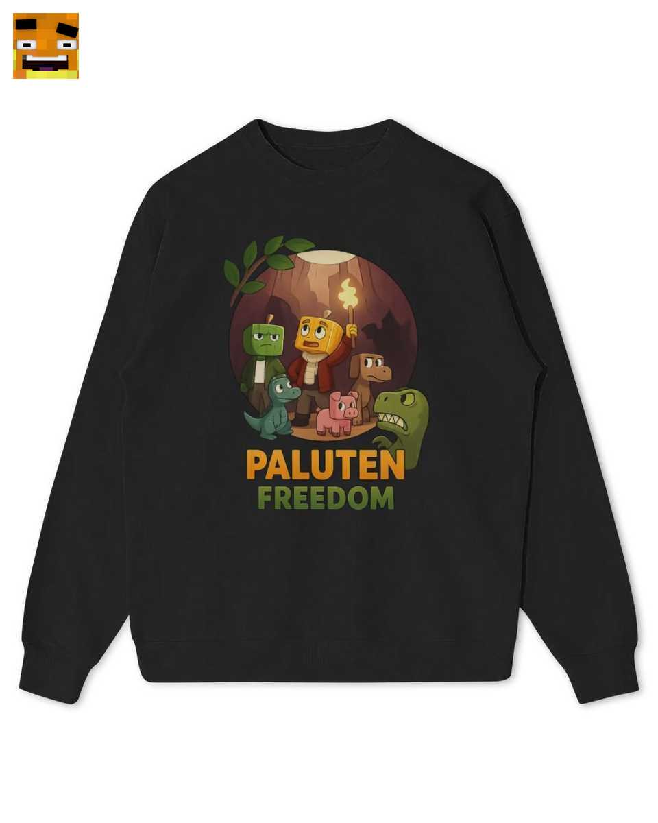 Das Design ist eine epische Hommage an Palutens Abenteuerwelt. Es zeigt Palle mit seinem ikonischen Kürbiskopf-Skin, Schweinchen Edgar und Dinos auf einer spannenden Höhlenexpedition. Der “PALUTEN FREEDOM”-Schriftzug rundet das Motiv perfekt ab und symbolisiert den Geist des Freedom Squads.