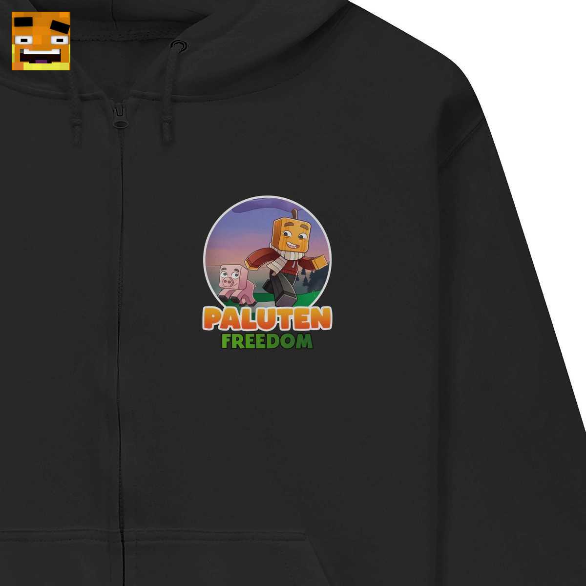 Das Design ist eine Hommage an das legendäre Minecraft Freedom Projekt. Es zeigt Paluten als Kürbis-Held und sein treues Schwein Edgar auf einer fröhlichen Wanderung durch eine blockige Welt bei Sonnenuntergang, eingerahmt von den ikonischen “PALUTEN” und “FREEDOM” Schriftzügen.