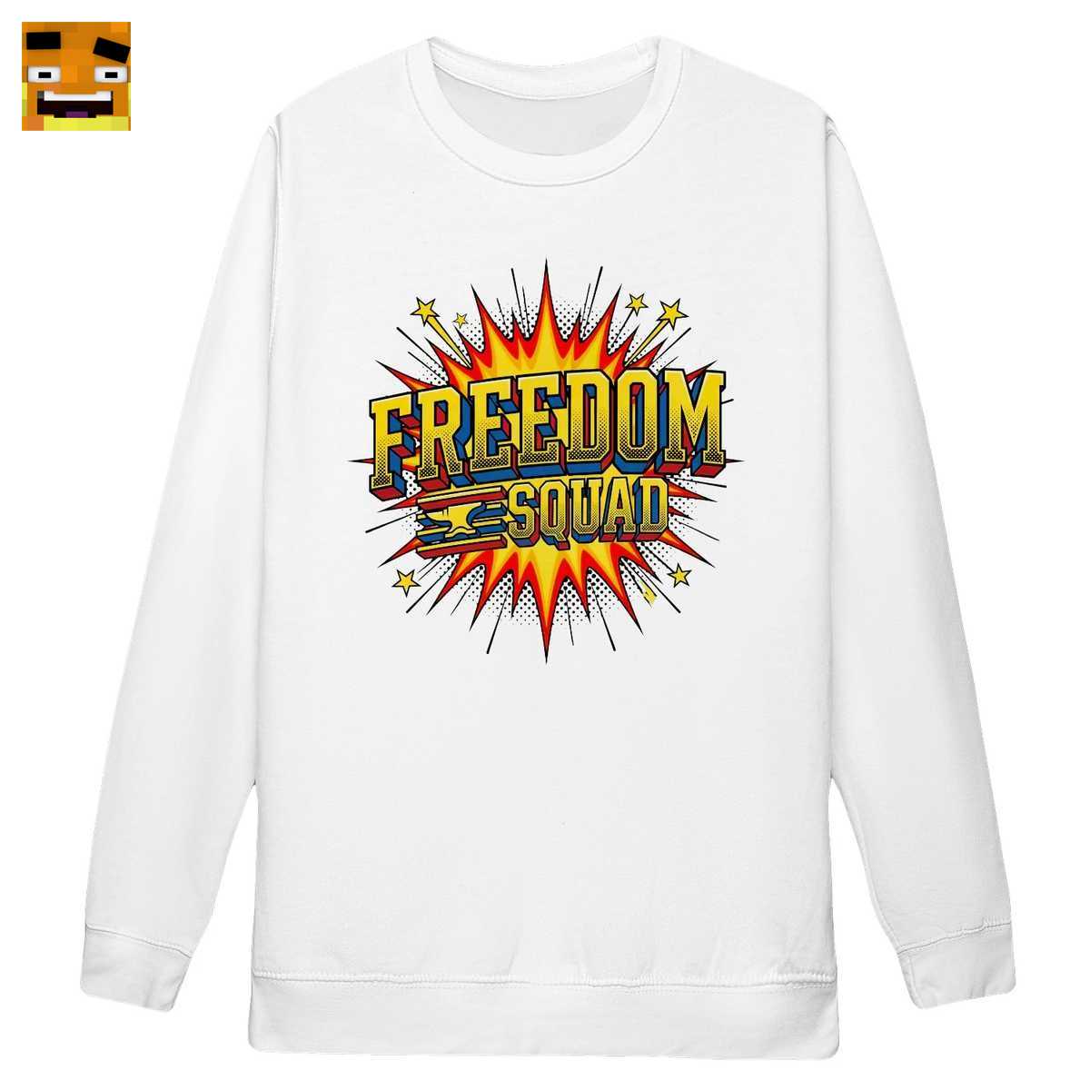 Das Design ist eine Hommage an klassische Superhelden-Comics und fängt die explosive Energie des Freiheitsteams perfekt ein. Mit seinem knalligen “FREEDOM SQUAD” Schriftzug, leuchtenden Farben und einem dynamischen Hintergrund ist es ein sofortiger Blickfang und ein klares Bekenntnis zur Community.
