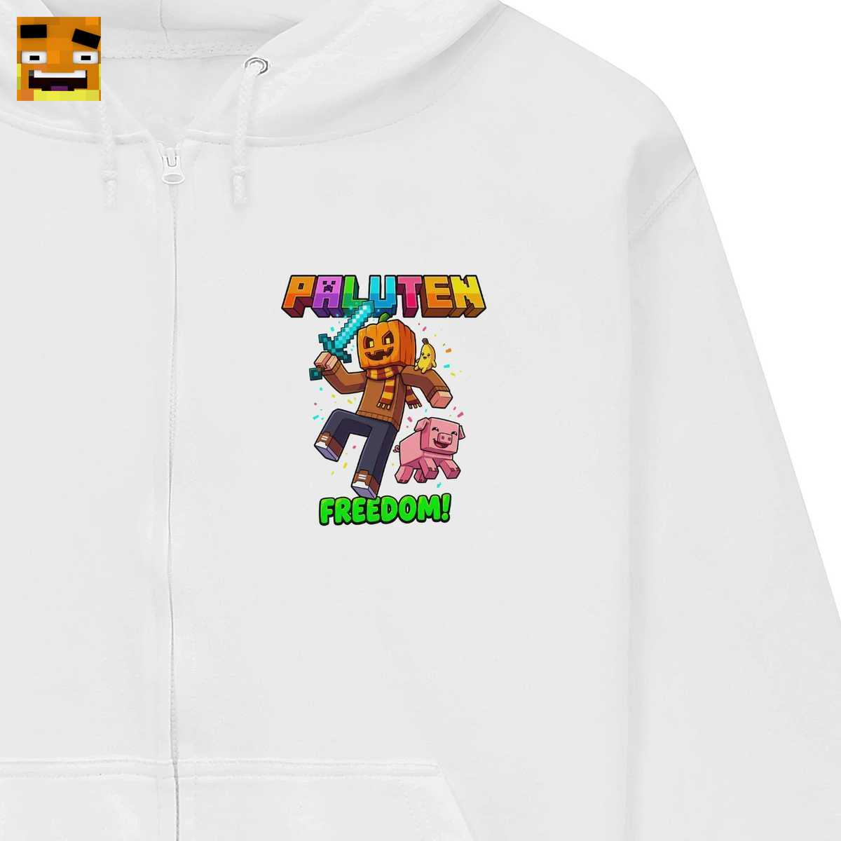 Dieses Design ist eine Hommage an Palutens Freedom Projekt und vereint alle ikonischen Elemente: Paluten mit Kürbiskopf, sein treues Schwein Edgar, ein Pixel-Schwert und den lauten Ruf “FREEDOM!”. Es ist nicht nur ein T-Shirt, sondern ein Stück Gaming-Kultur und ein starkes Symbol für die Community.