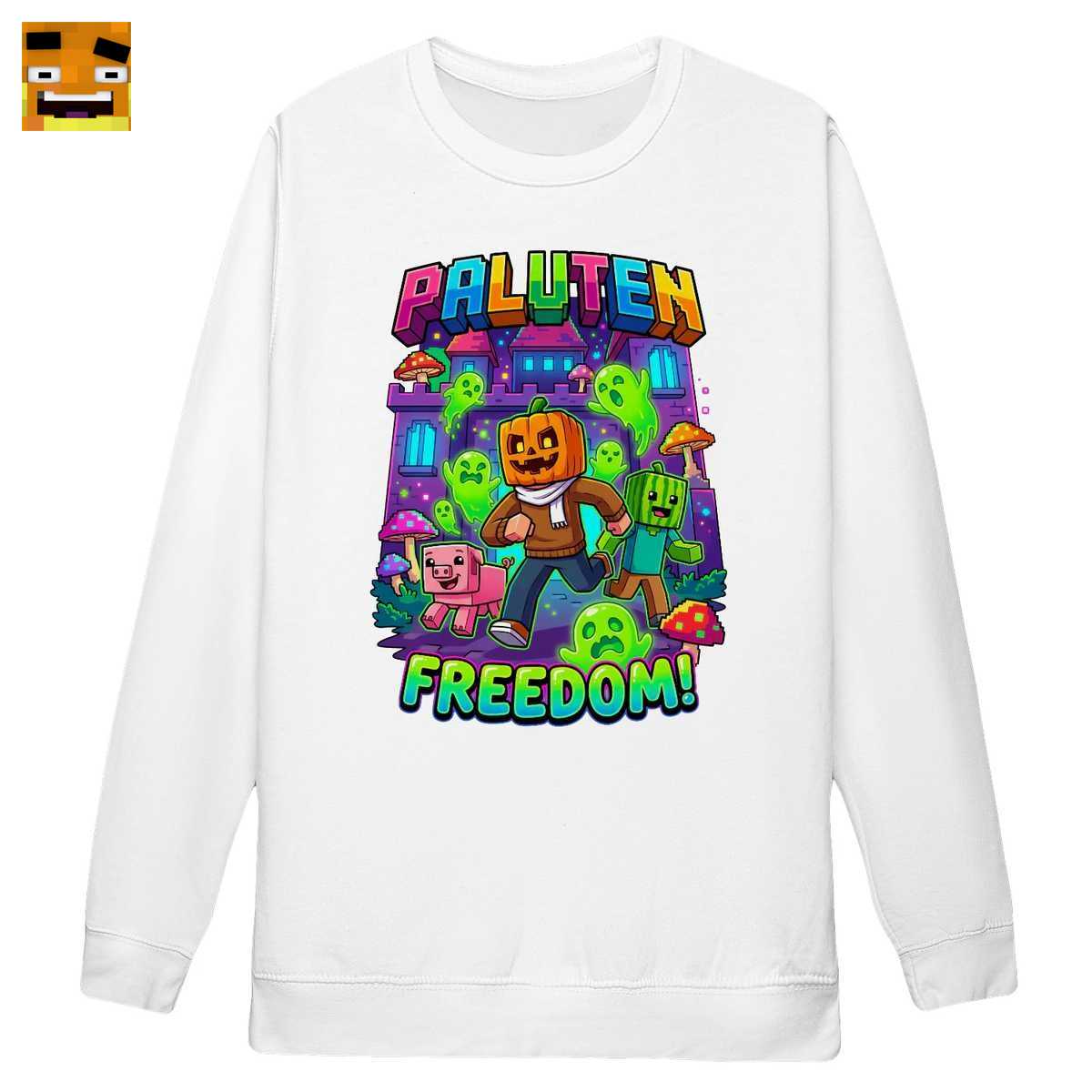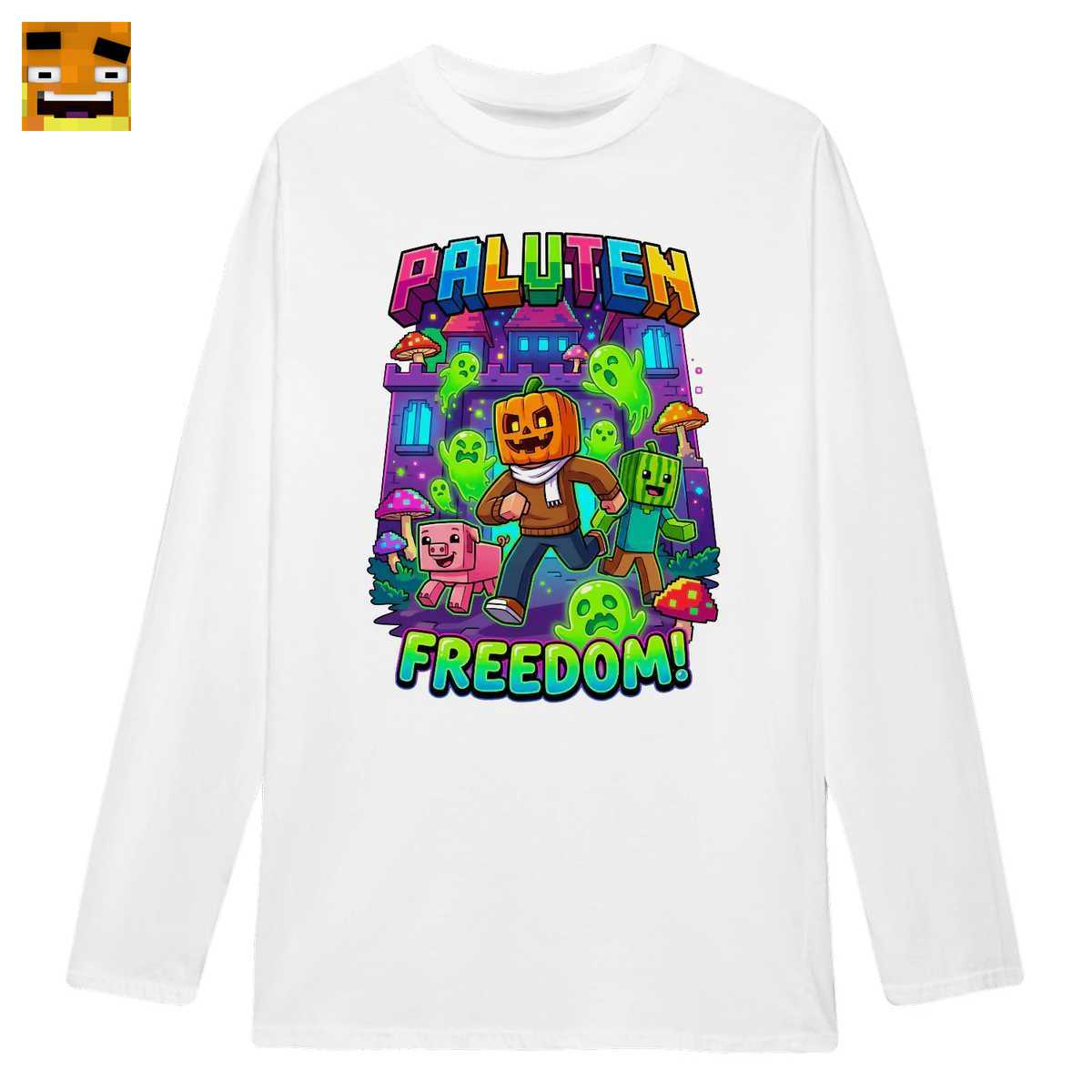 Die Szenerie ist dramatisch und farbenfroh zugleich. Sie fliehen aus einem unheimlichen, in tiefem Lila gehaltenen Spukschloss, während ihnen leuchtend grüne Geister nachjagen. Die Atmosphäre ist greifbar – eine Mischung aus Grusel und Triumph. Bunte Pilze säumen ihren Fluchtweg und verleihen dem Design einen Hauch von Minecraft Stil Kleidung und Fantasy-Welt. Gekrönt wird das actiongeladene Motiv vom großen, farbenfrohen ‘PALUTEN’ Schriftzug oben und dem alles entscheidenden Wort unten: ‘FREEDOM!’. Dieser Ruf nach Freiheit fängt die Essenz des Moments perfekt ein und macht das Kürbiskopf Gaming Shirt zu einem kraftvollen Statement.