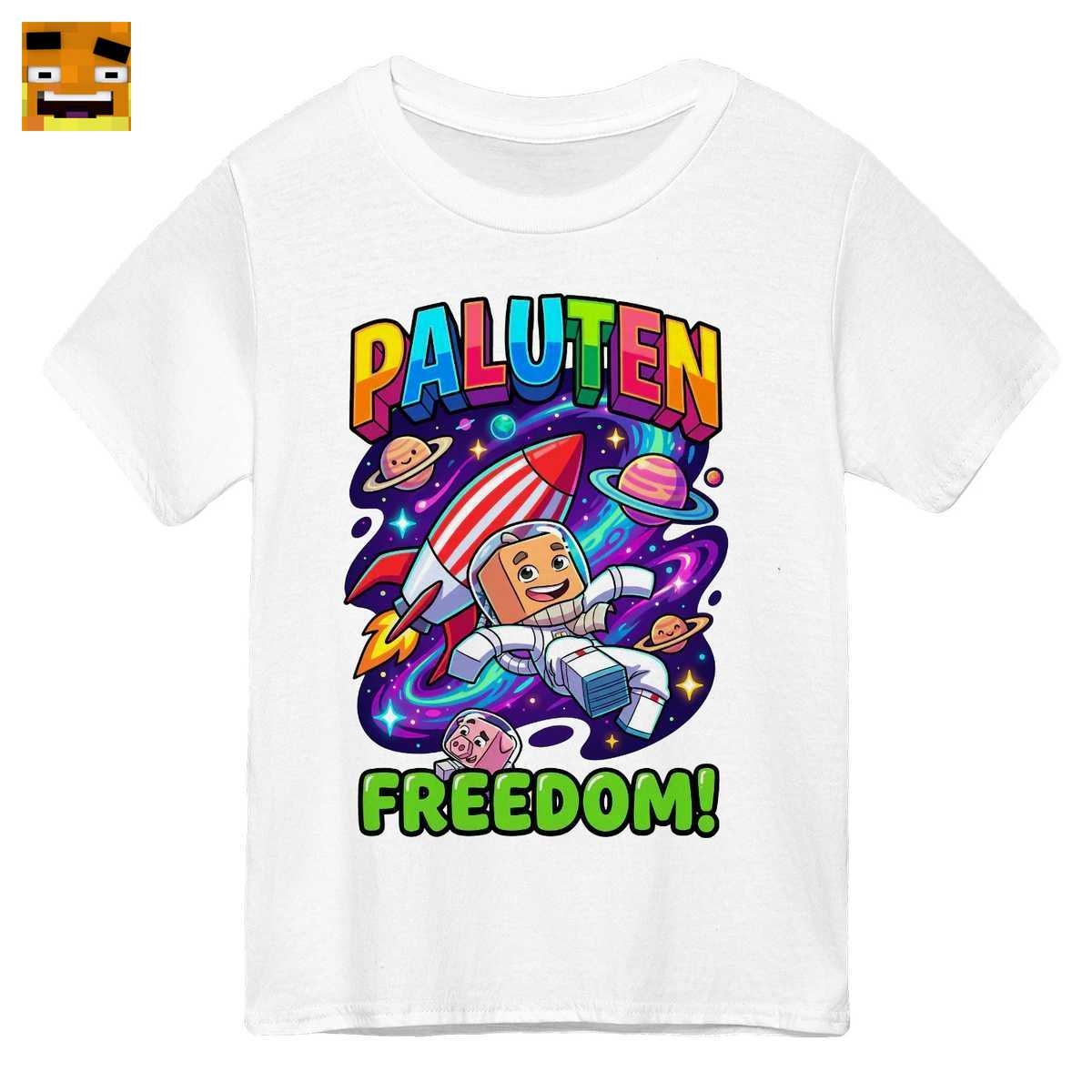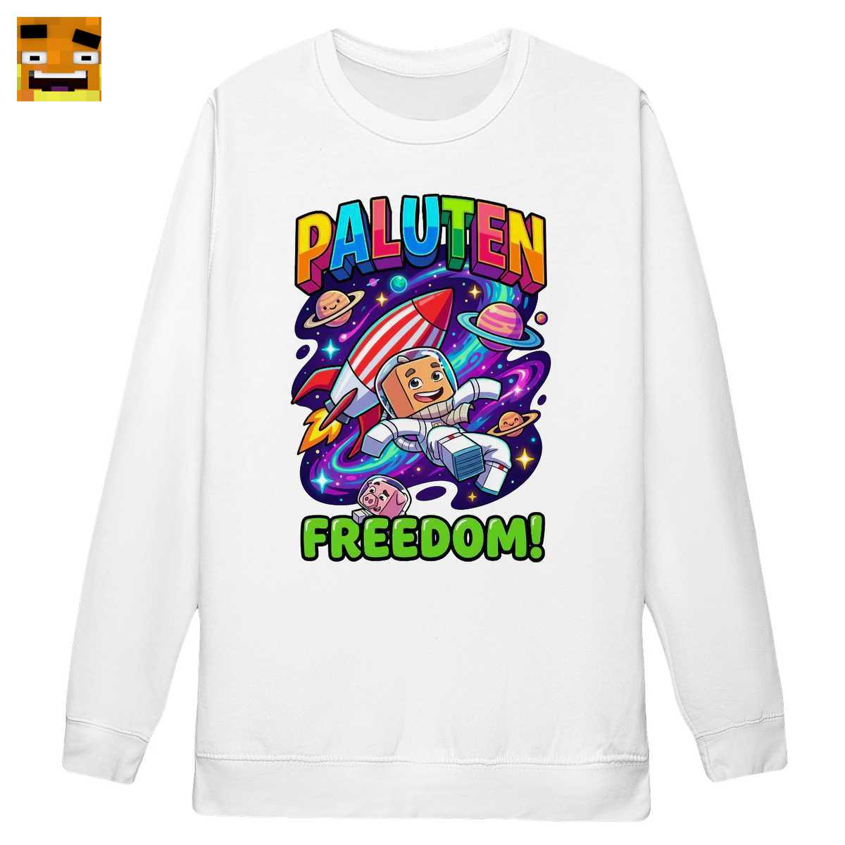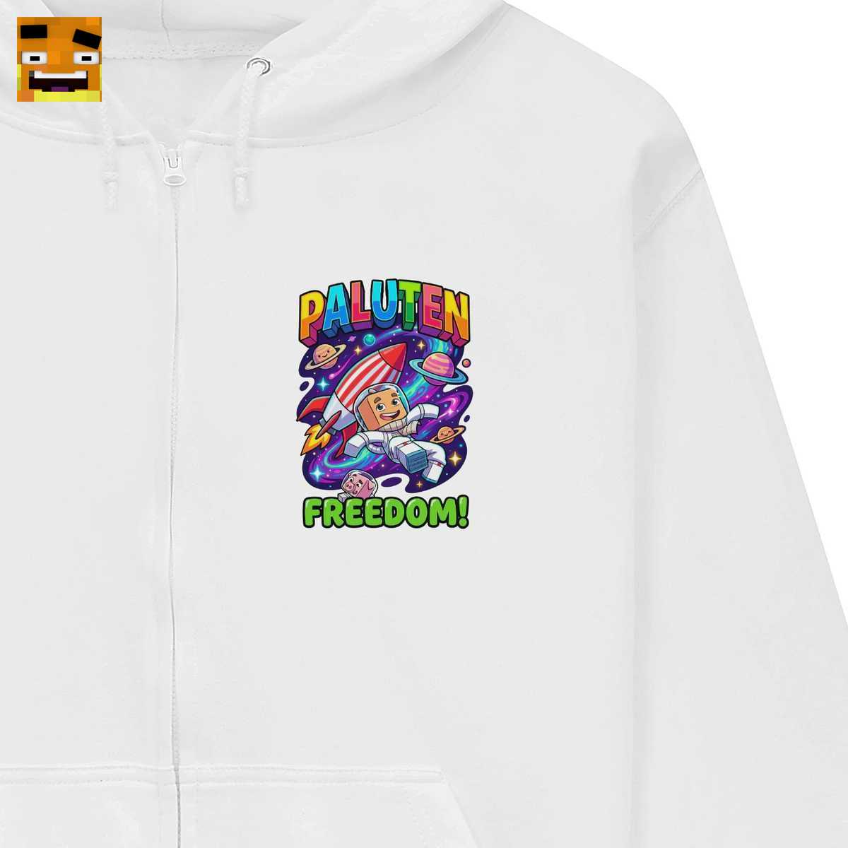 Der Hintergrund ist eine Explosion aus Farben und Action. Eine dynamische, rot-weiße Rakete – ein klares Symbol für das Paluten Raketen Design – startet in die unendlichen Weiten. Bunte Planeten und ein leuchtender Nebel schaffen eine lebendige Galaxie, die die Fantasie anregt und an die besten Momente aus dem Palle Shop Weltraum-Thema erinnert. Der Schriftzug “PALUTEN” in leuchtenden Regenbogenfarben unterstreicht die positive und bunte Energie, die Palle ausstrahlt. Darunter prangt das Wort “FREEDOM!” in einem knalligen Grün, eine direkte Referenz an sein berühmtes Minecraft Freiheit Merch. Es ist mehr als nur ein Wort; es ist das Motto eines ganzen Projekts, das für Kreativität, Freundschaft und das Brechen von Grenzen steht. Das gesamte Design ist im lebhaften Cartoon-Stil gehalten, was es zu einem echten Hingucker und einem lustigen Zocker Design macht.