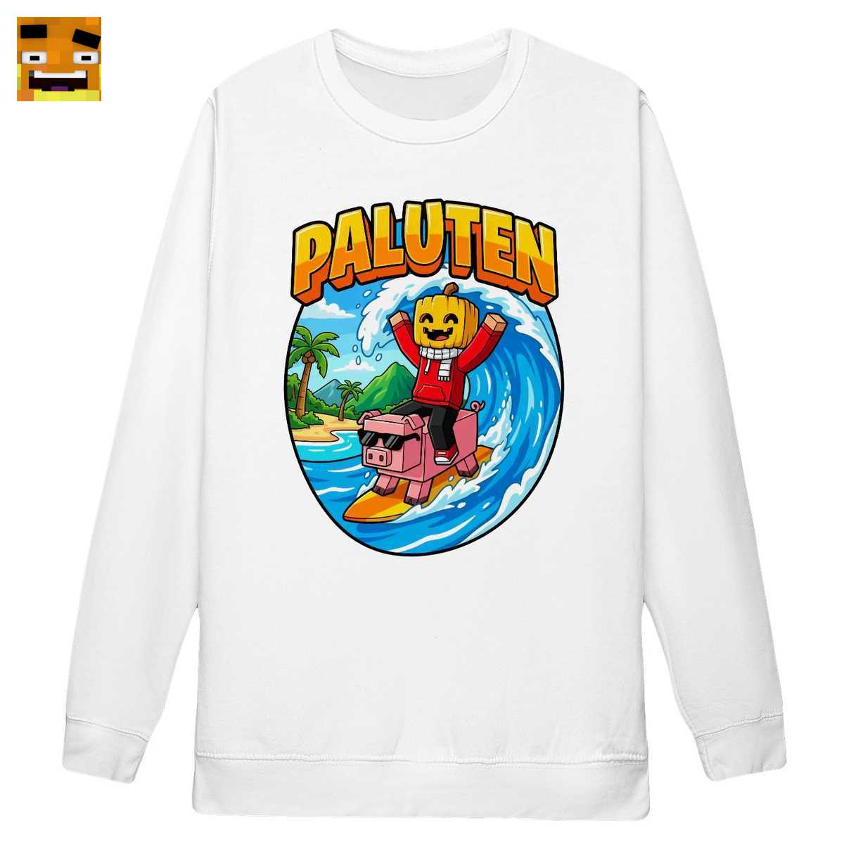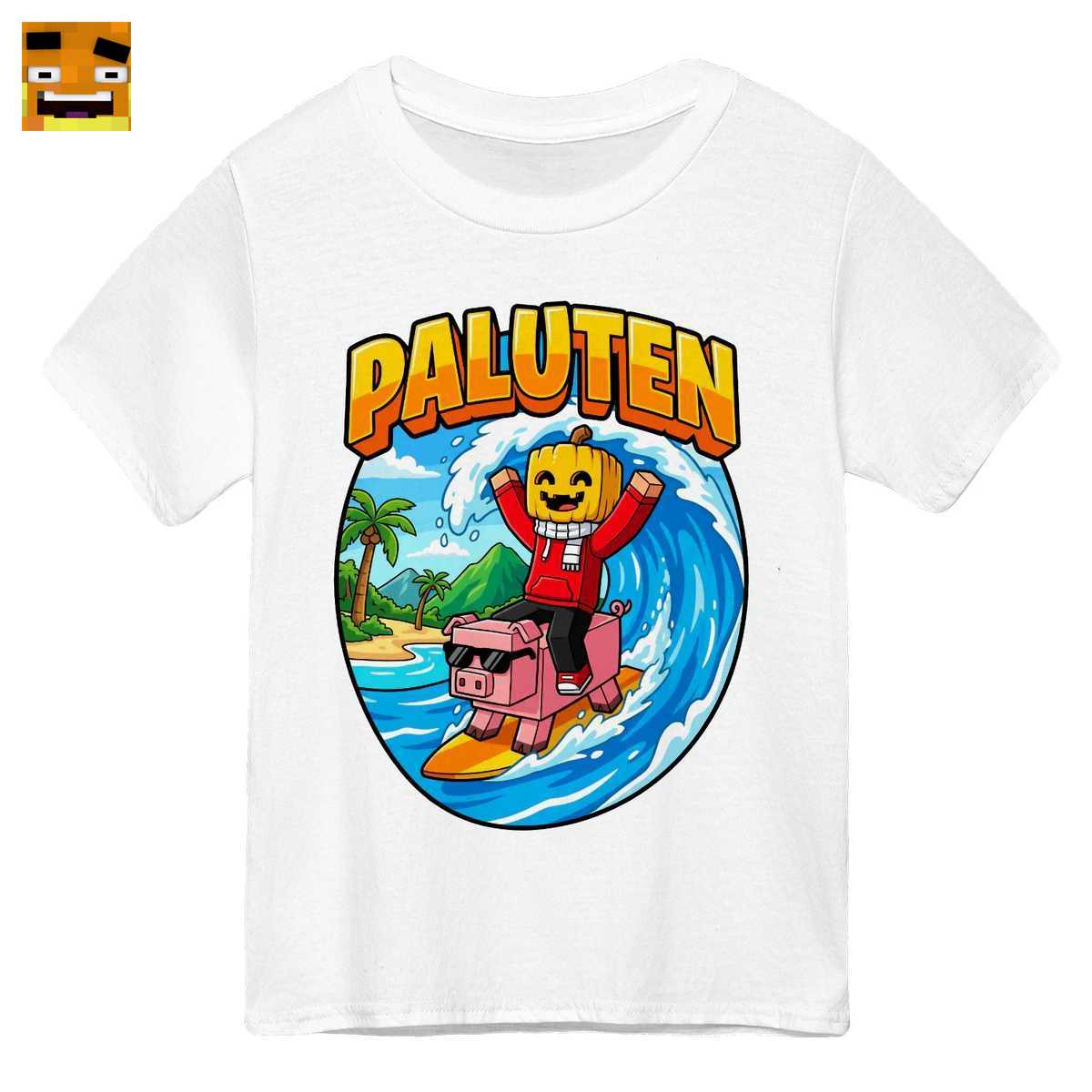 Dieses T-Shirt ist eine Explosion aus Farbe und guter Laune. Es ist mehr als nur ein Gaming T-Shirt im Block-Stil; es ist eine Momentaufnahme purer Freude. Im Zentrum steht Paluten, unverkennbar mit seinem Kürbiskopf-Skin und dem knallroten Hoodie, die Arme jubelnd in die Luft gerissen. Er reitet nicht alleine: Sein treuer Begleiter, das blockartige Schwein Edgar, sitzt lässig mit Sonnenbrille vor ihm auf dem Surfbrett. Gemeinsam meistern sie eine dynamische, blaue Sommerwelle.