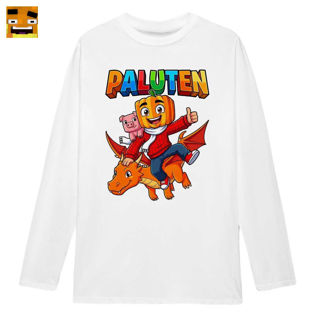 Dieses T-Shirt ist nicht einfach nur ein “YouTuber Merch für Jungen” – es ist eine Hommage an die fantasievolle Welt, die Paluten für seine Community erschaffen hat. Das zentrale Motiv ist ein echter Hingucker und steckt voller liebevoller Details, die jeder Fan sofort erkennt und liebt. Im Mittelpunkt steht Palle, dargestellt als sympathischer Charakter mit seinem ikonischen Kürbiskopf, der mit einem siegessicheren “Daumen hoch” auf dem Rücken eines freundlichen, leuchtend orangefarbenen Drachen reitet.