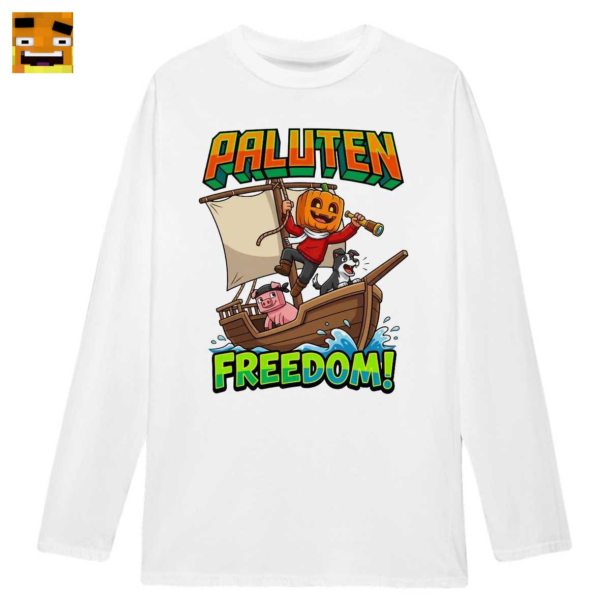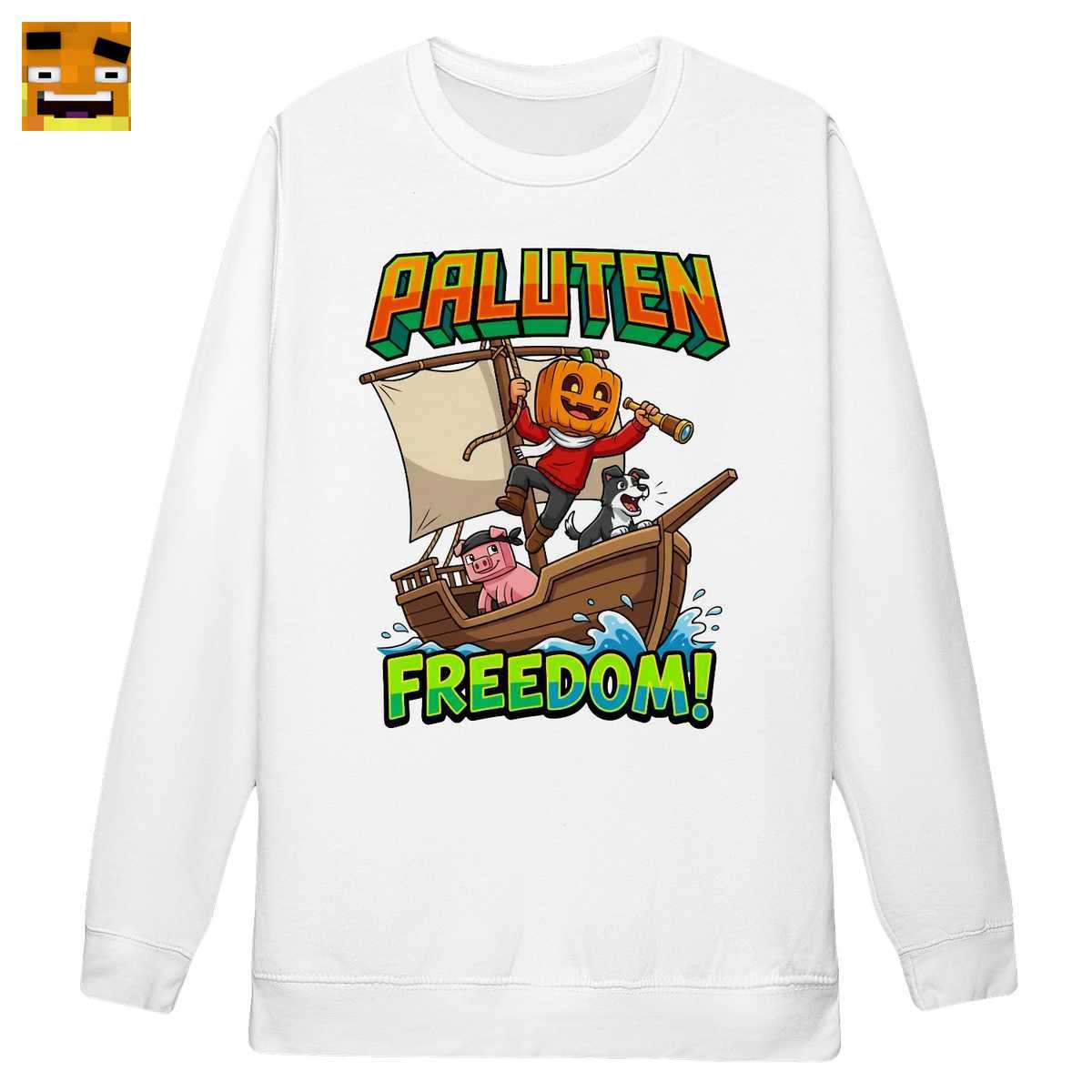 Dieses T-Shirt ist nicht einfach nur ein Kleidungsstück; es ist eine Leinwand, die eine Geschichte erzählt. Eine Geschichte von Abenteuer, Freundschaft und dem unbändigen Streben nach Freiheit, die Millionen von Fans mit dem YouTuber Paluten verbinden. Das zentrale Motiv fängt die Essenz des “Freedom”-Projekts perfekt ein, das weit mehr ist als nur eine Let’s-Play-Reihe – es ist ein eigenes Universum. Im Mittelpunkt steht natürlich Paluten selbst, dargestellt in seinem ikonischen Cartoon-Stil mit dem unverkennbaren Kürbiskopf. Er steht am Steuer eines hölzernen Schiffes, den Blick entschlossen auf den Horizont gerichtet, bereit, in See zu stechen und neue Welten zu entdecken. Dieses Bild ist eine direkte Anspielung auf den “Paluten Freiheit Comic” oder die “Paluten Graphic Novel”, in der diese Abenteuer visuell zum Leben erweckt werden.
