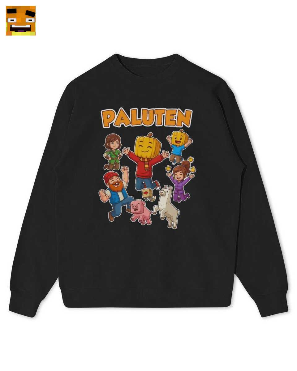 Dieses T-Shirt ist eine Liebeserklärung an das Universum von Paluten. Es ist mehr als nur ein Logo; es ist eine Szene voller Leben und Freude, die jeden Fan sofort begeistern wird. Im Mittelpunkt steht natürlich Palle selbst, erkennbar an seinem Markenzeichen, dem leuchtenden Kürbiskopf – ein Symbol für unzählige lustige Momente und spannende Minecraft-Abenteuer. Doch ein Held ist nichts ohne sein Team. Deshalb wird er von seinen treuesten Begleitern umringt: dem unverkennbaren Schweinchen Edgar und einem der fröhlichen Lamas, die in seinen Videos für so viel Chaos und Lacher sorgen. Die Darstellung aller Charaktere, die energiegeladen in die Luft springen, fängt die positive und dynamische Atmosphäre seiner Videos perfekt ein.