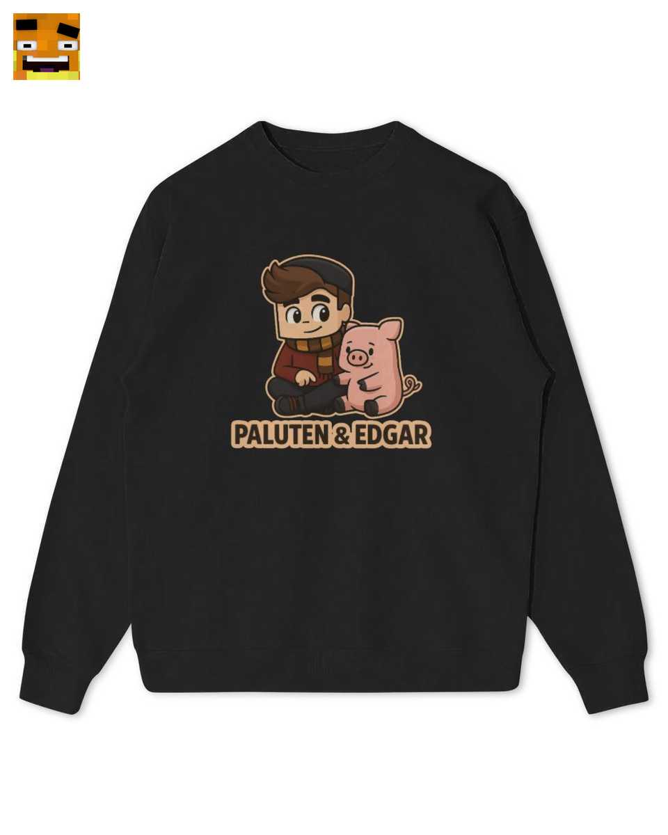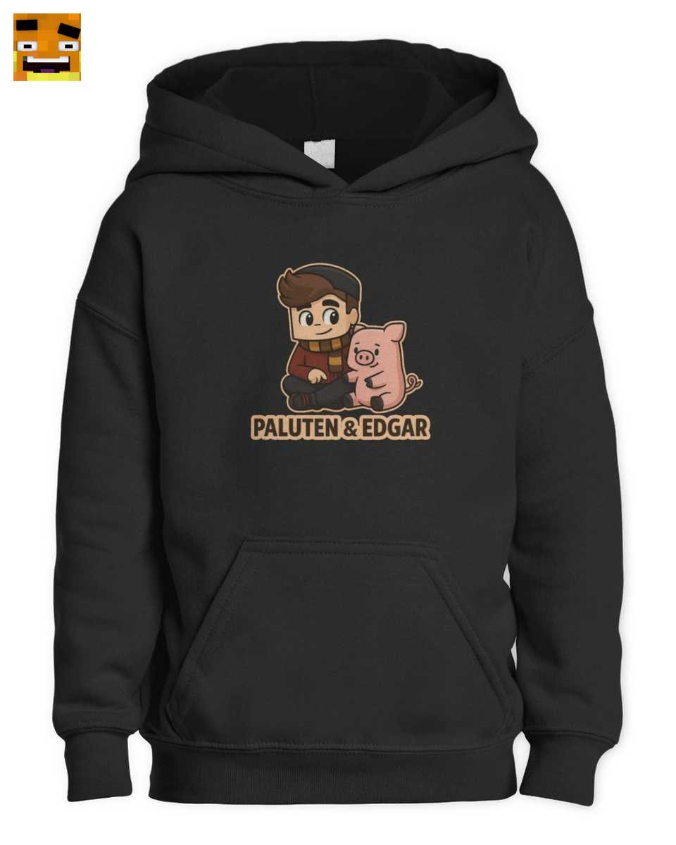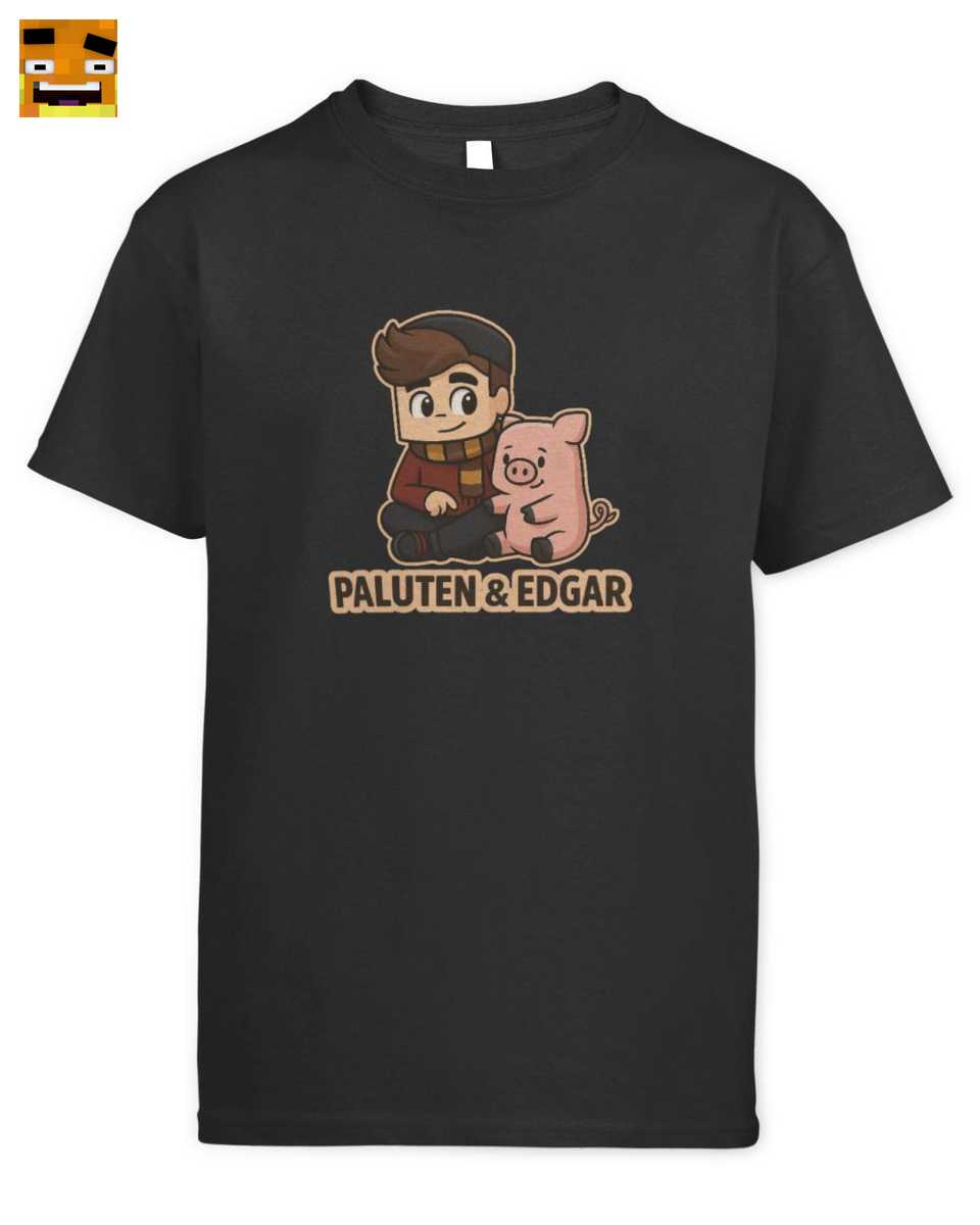 Im Zentrum des Designs sitzt Paluten in seinem ikonischen Outfit mit Mütze und gestreiftem Schal, lächelnd neben dem süßen rosa Schwein Edgar. Der klare Schriftzug ‘PALUTEN & EDGAR’ unterstreicht die Botschaft und lässt keinen Zweifel daran, wem die Herzen der kleinen Fans gehören. Es ist ein echtes Beste Freunde T-Shirt, das Werte wie Loyalität und Zusammenhalt vermittelt – Themen, die in Palutens Videos eine große Rolle spielen. Dieses niedliche Gamer Shirt ist somit nicht nur ein modisches Statement, sondern auch ein Ausdruck der Begeisterung für die Abenteuer und Geschichten aus Palutens Minecraft-Welt. Es ist das perfekte Geschenk für einen Paluten Fan.