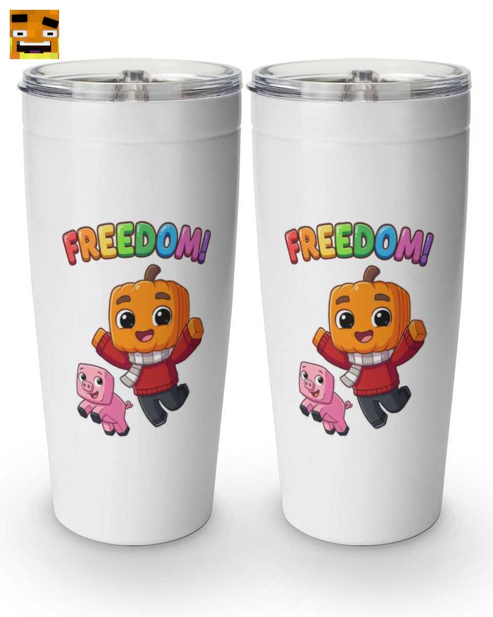 Das exklusive Design zeigt Palutens Kürbiskopf-Skin und Schweinchen Edgar in voller Aktion unter dem bunten ‘FREEDOM!’-Schriftzug. Es ist eine liebevolle Hommage an das Minecraft Freedom Projekt und die unzertrennliche Freundschaft der beiden Charaktere.