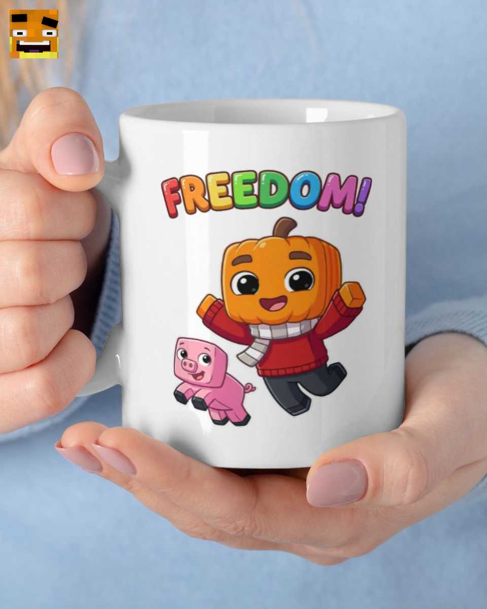 Diese Tasse ist eine Ode an Freiheit und Freundschaft. Das Herzstück ist das liebevoll gestaltete Motiv: Paluten in seinem ikonischen Kürbiskopf-Skin und das niedliche Schweinchen Edgar rennen voller Begeisterung und Tatendrang. Über ihnen prangt der farbenfrohe Schriftzug “FREEDOM!”, der sofort an die legendären Abenteuer aus dem Minecraft Freedom Projekt erinnert. Jedes Detail, von Palles fröhlichem Ausdruck bis zu Edgars treuem Blick, wurde eingefangen, um bei jedem Anblick ein Lächeln auf Ihr Gesicht zu zaubern. Es ist nicht nur ein Fanartikel, sondern ein Stück der Geschichte, das die Werte von Abenteuer, Zusammenhalt und natürlich grenzenloser Freiheit zelebriert.